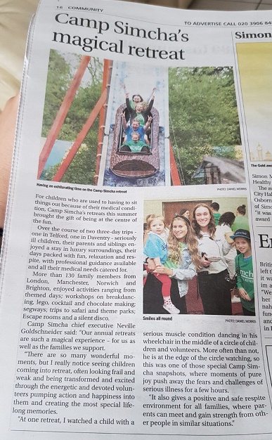 Thank you to the Jewish Weekly for featuring this article about our retreat. Children’s Retreat is a special weekend organised for children with serious and life-changing medical conditions. The children come without their parents for an exciting programme run over three days, catering to each child’s specific needs. Young volunteers join Camp Simcha staff on retreat to ensure the children have a fantastic time.