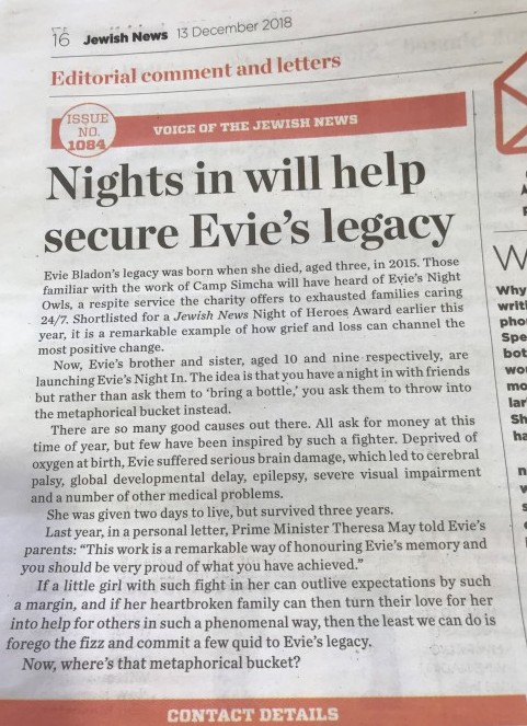 Thank you to the ‘Voice of the Jewish News’ for featuring the article about Evie’s Night Owls latest project – ‘Evie’s Night In’.