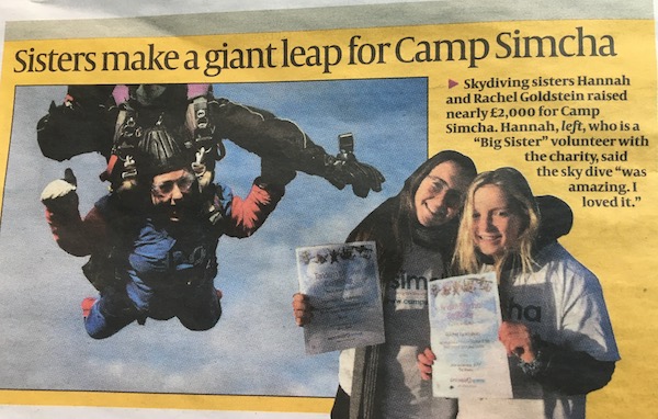 More amazing jumping from the skies by Hannah and Rachel Goldstein who raised £2700 jumping from a plane. They also made the press when the Jewish Chronicle featured their achievements.