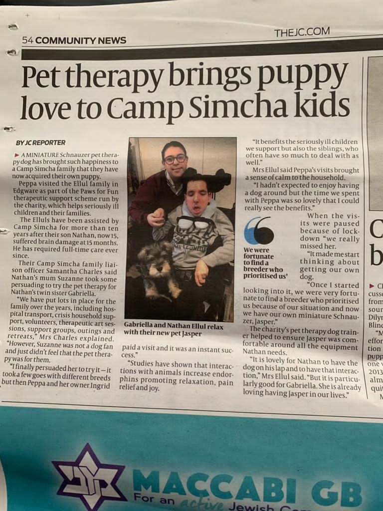 “After we made our decision, Sam arranged for the Camp Simcha Pet Therapy dog trainer Lynda to help us to get settled and also to ensure Jasper was comfortable around all the equipment Nathan needs.