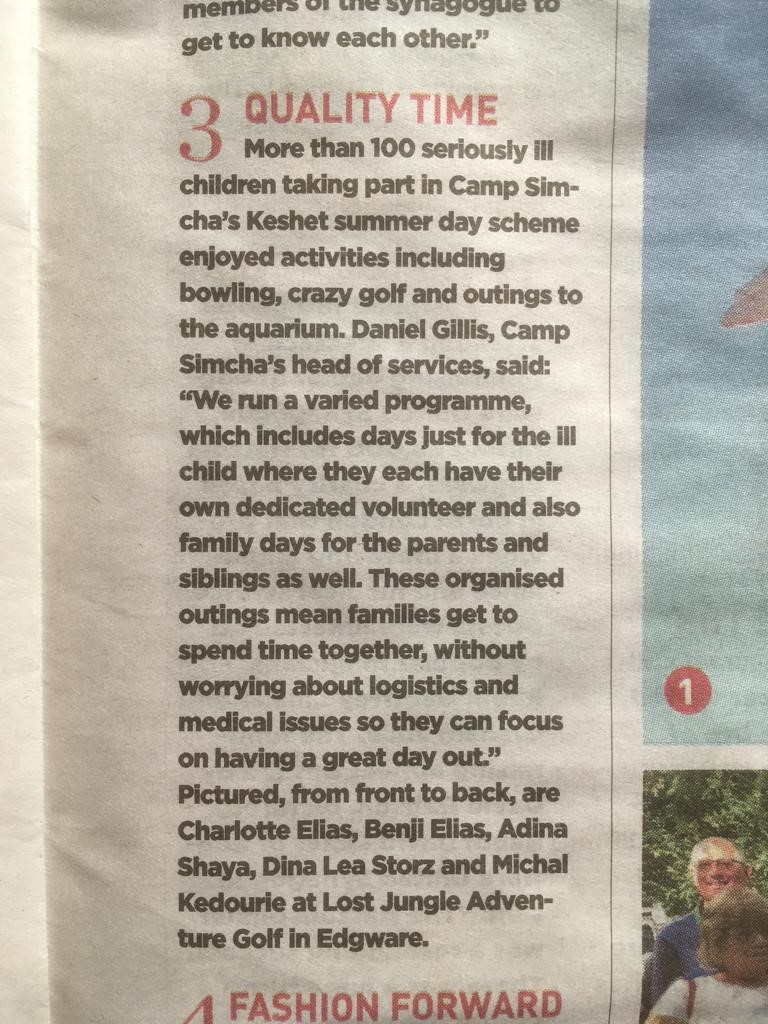 Thanks to the Jewish News for featuring a piece about Keshet, our summer programme. Our Asher and Betty Loftus z’l, ‘Keshet’ – summer day scheme, runs for nine days over a period of three weeks in the summer. Many of the families we support are unable to send their children to camps over the summer due to complex medical conditions. Camp Simcha’s summer day scheme exists to make the holiday time easier for these families and ensure the children have a fun and exciting summer.
