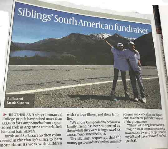 Brother and Sister, Jacob and Bella Sarano, raised more than £13,000 for Camp Simcha from a sponsored trek in Argentina to mark their Bar and Batmitzvah as part of our Make a Simcha program. They asked for no gifts for their Bar and Bat mitzvah but for all guests to donate to the charity instead.