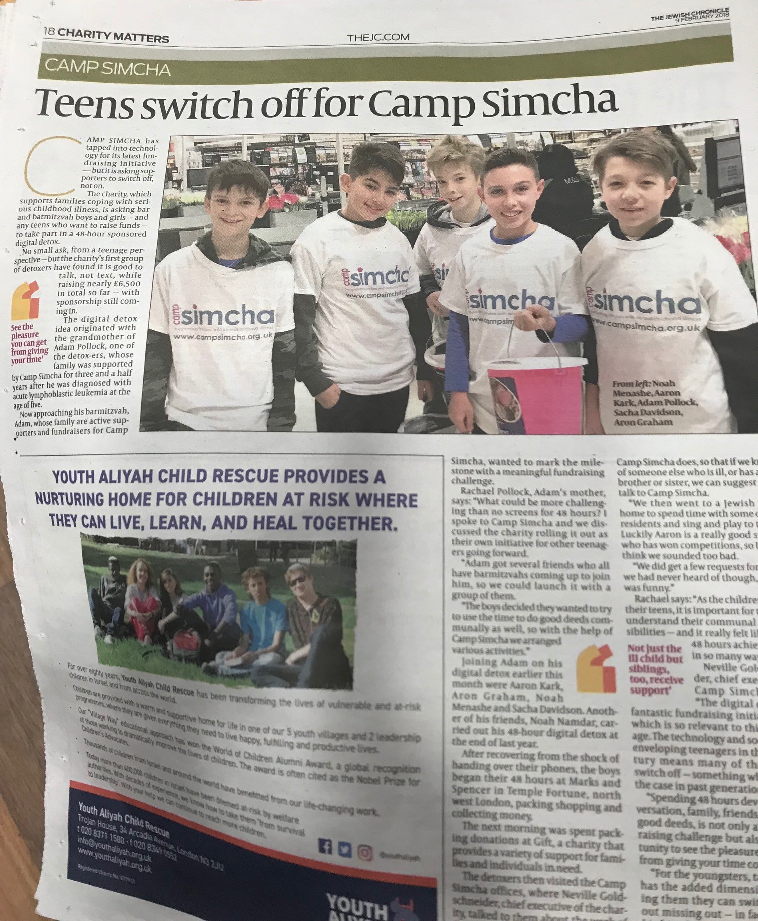 The article showcased our first group of Digital Detoxers – Adam Pollock and his friends, who wanted to mark Adam’s upcoming Bar Mitzvah. Adam was supported by Camp Simcha for 3 and a half years after he was diagnosed with acute lymphoblastic leukemia at the age of 5. They gave up their phones and ipads for 48 hours and spent their time doing a number of good deeds in the community, including packing shopping and collecting money at Marks & Spencer, packing donations at Gift and even came into the Camp Simcha offices to hear from our Chief Executive, Neville Goldschneider, about the work Camp Simcha does.