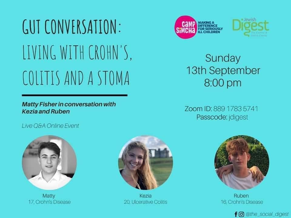 Now in remission from his condition, thanks to medication, diet and lifestyle changes, Ruben joined 21-year-old Kezia Sinclair-Horne for an online event hosted by Camp Simcha and Jewish Digest to raise awareness and share their experiences to help others coping with Crohn’s and colitis.