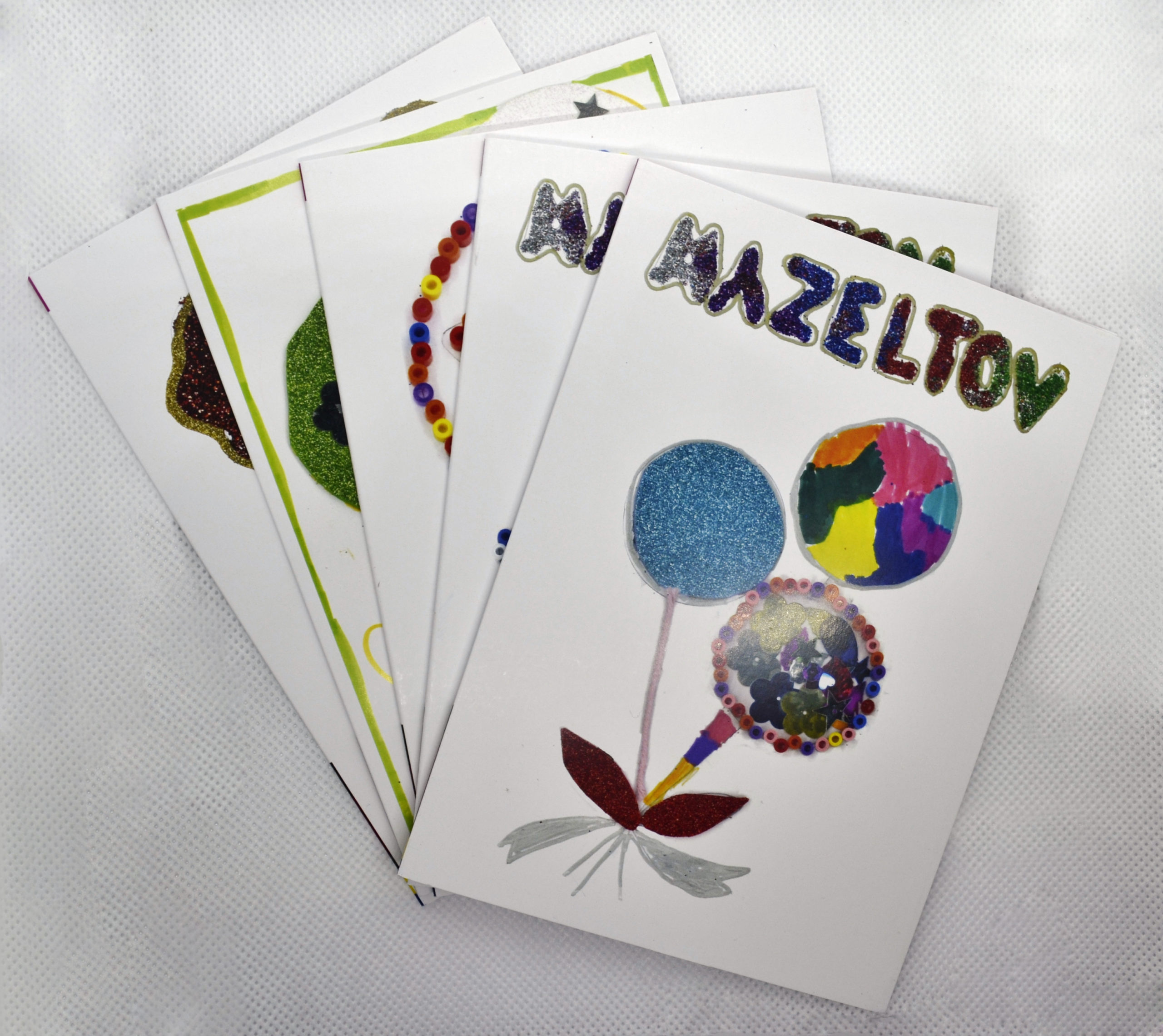 Our pack of 5 wonderful Mazel Tov cards, designed by Camp Simcha children.